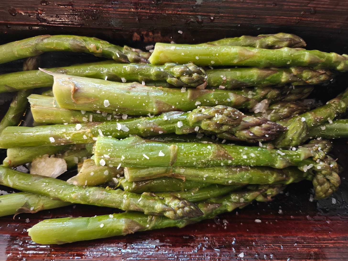 Ontario asparagus cooked to firm-tender in water, drained, dressed with good olive oil & lemon juice, and sprinkled with salt