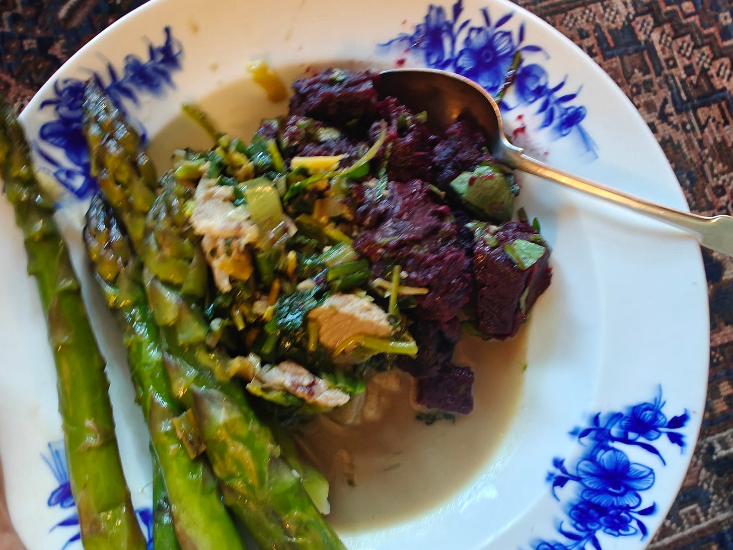 NOTE: For those who are interested: The other dishes in that meal were a stir-fry of greens (chopped dandelion with some radish tops and a spring onion) with a little sliced pork, and a heap of local asparagus cooked in salted water and then dressed with squeezed lemon juice, olive oil, and salt. The early flavourings that went into the hot stir-fry oil were mustard seed, fennel seed, minced galangal and ginger, and a little turmeric powder; the chopped onion went in next, followed by the greens; after a little stir-frying I added the pork, stir-fried it briefly, then added some water. The dish simmered to doneness very easily.