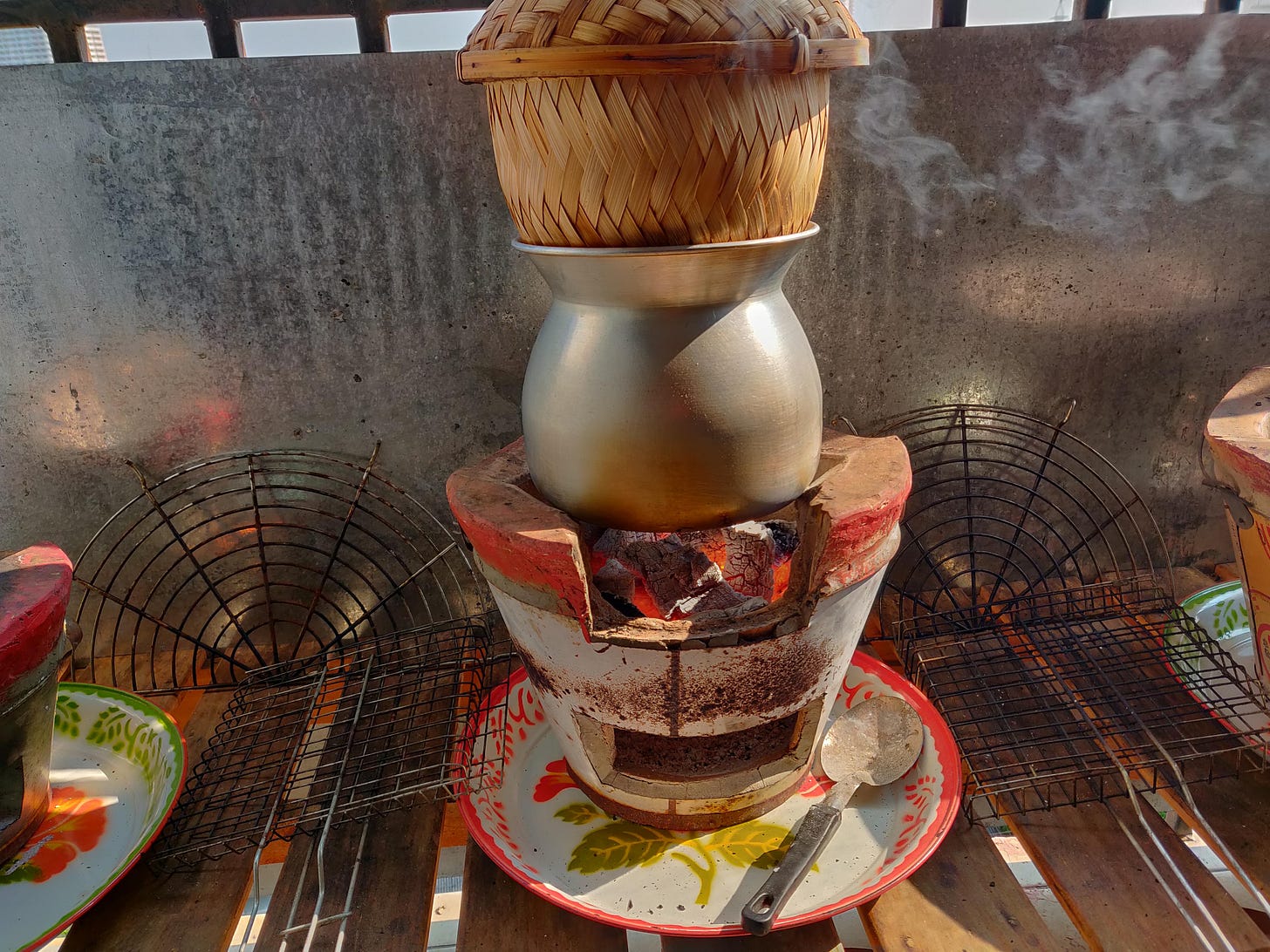 a traditional charcoal stove in Chiang Mai, with sticky rice steaming in a basket