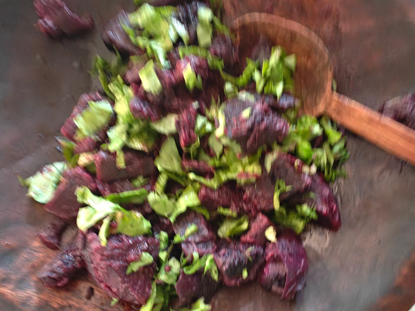 a rushed photo of the dressed purple yam with sorrel and parsley