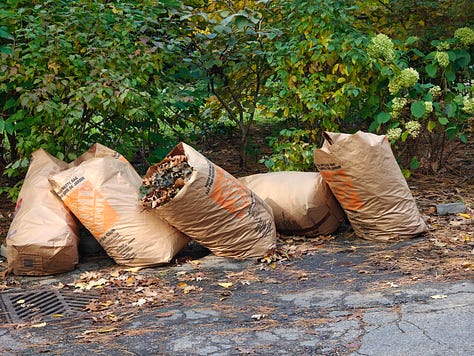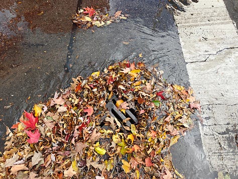 shots from this week: Wychwood pond; bags of gathered leaves; leaves and water by a drain