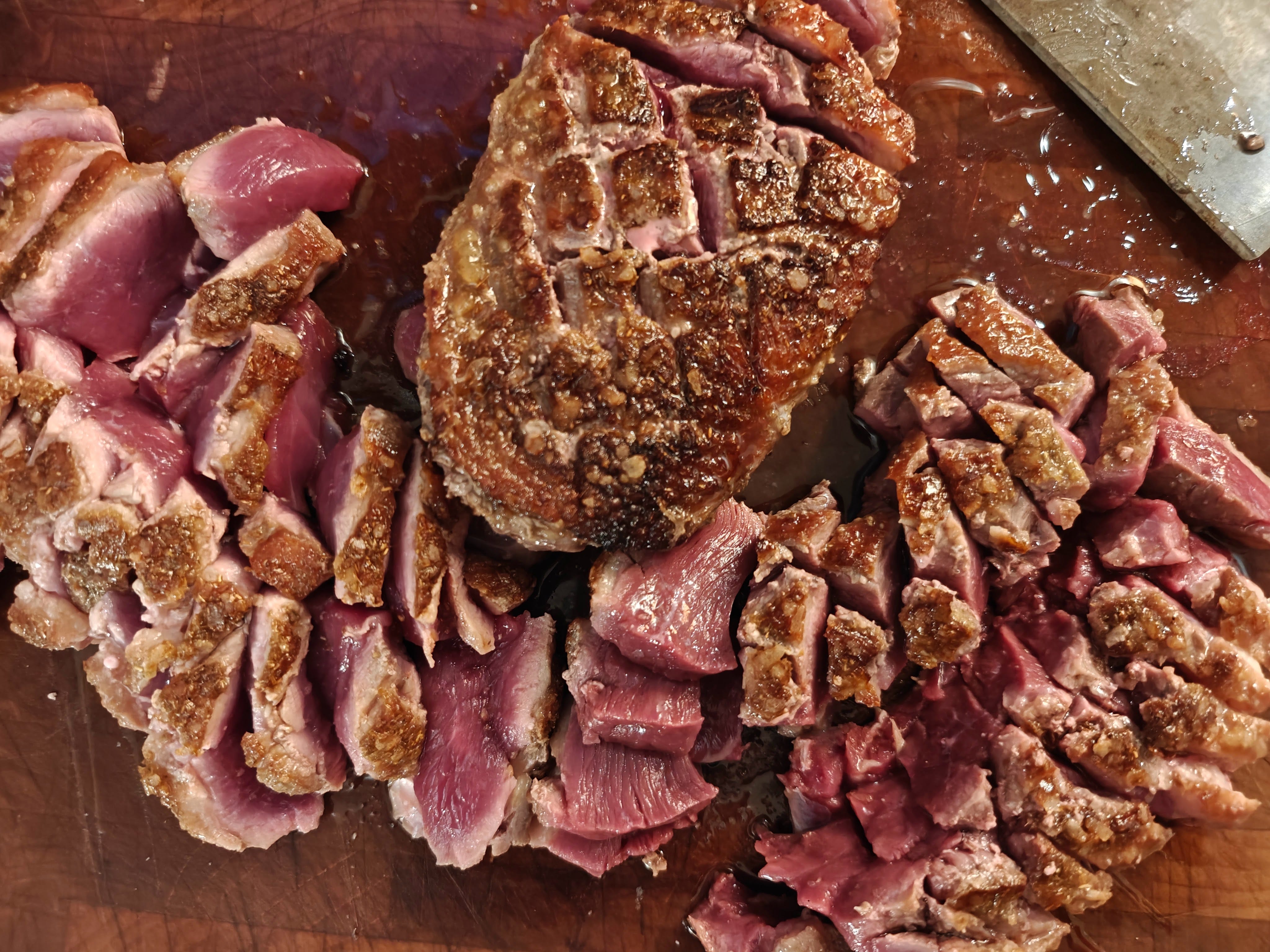 Boneless duck breasts feel like a luxury, but they can be quite economical. I like to have two or three in my freezer, to have on hand for last-minute events. They defrost quickly. I rub salt or shio koji, and perhaps an aromatic such as blue fenugreek powder. on the fat side, then cut a cross hatch pattern on it. I sear them in a lightly oiled cast-iron skillet, starting at a mild heat and increasing it, until I have a browned crisp surface. I turn the breasts over to touch the flesh side with heat for about a minute or two only. Then they can sit for awhile before I slice them.