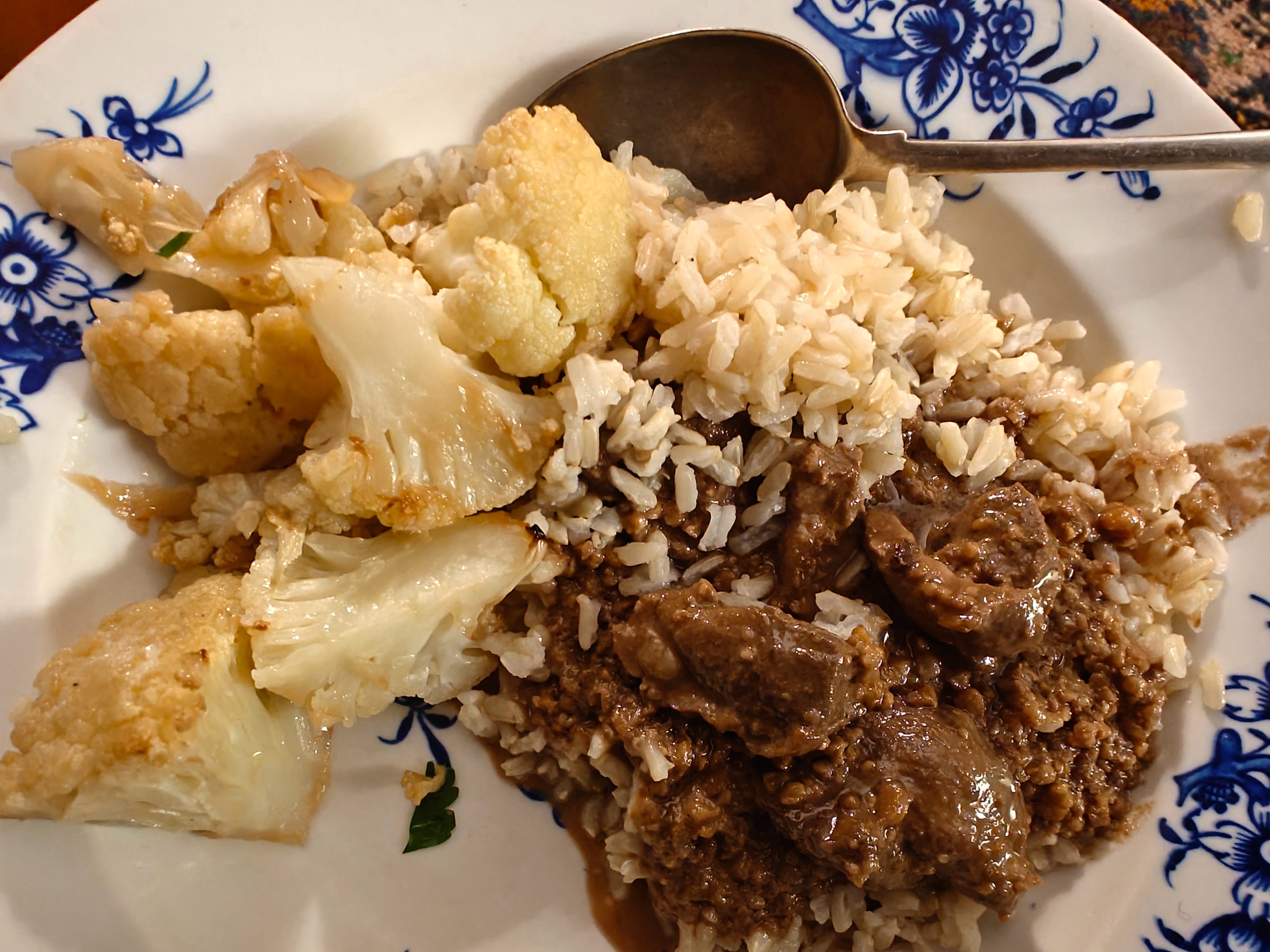 supper earlier this week: fesanjun with brown basmati and a side of roast cauliflower. As you can see, fesanjun is not especially photogenic. But it is so delicious!